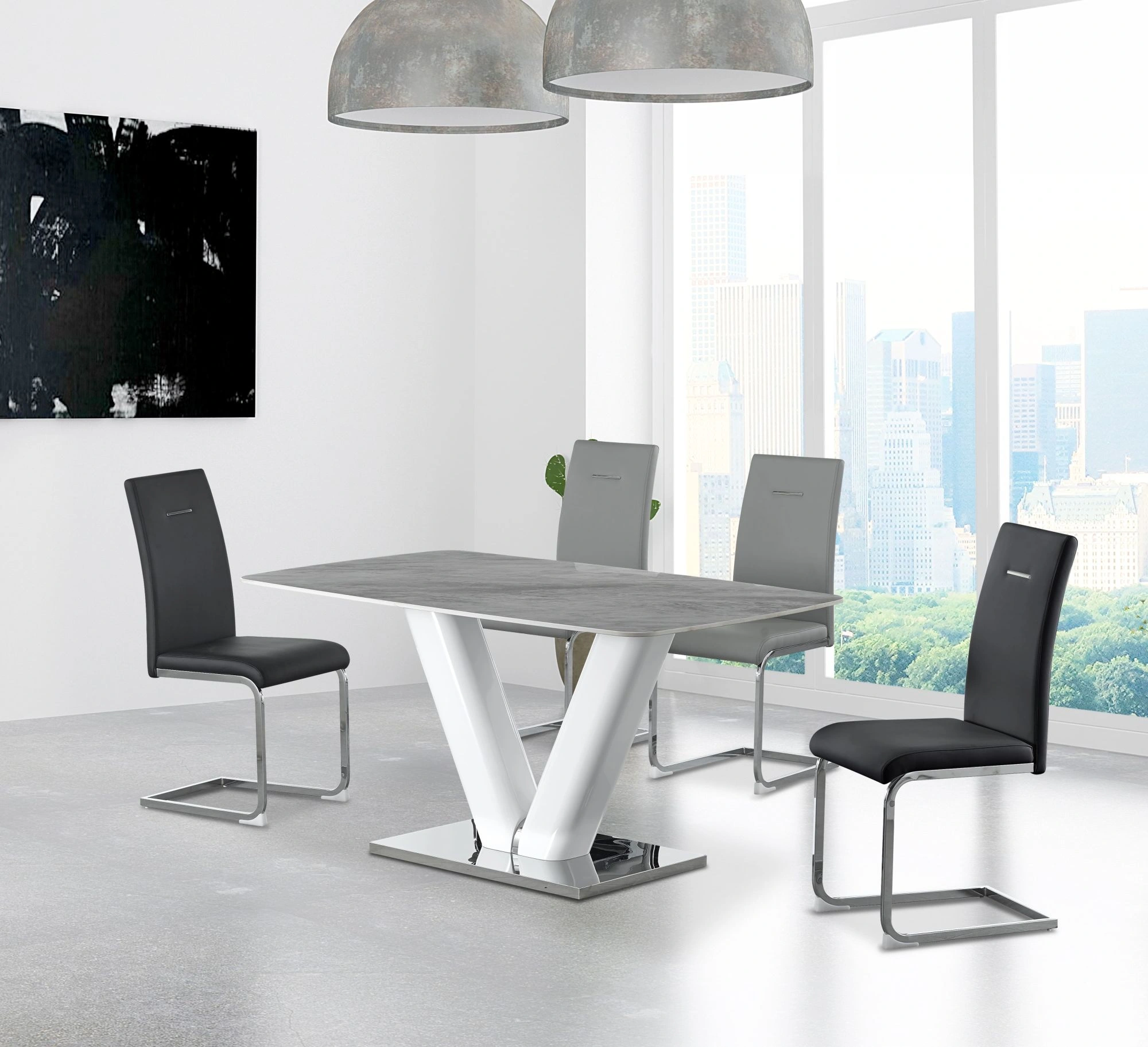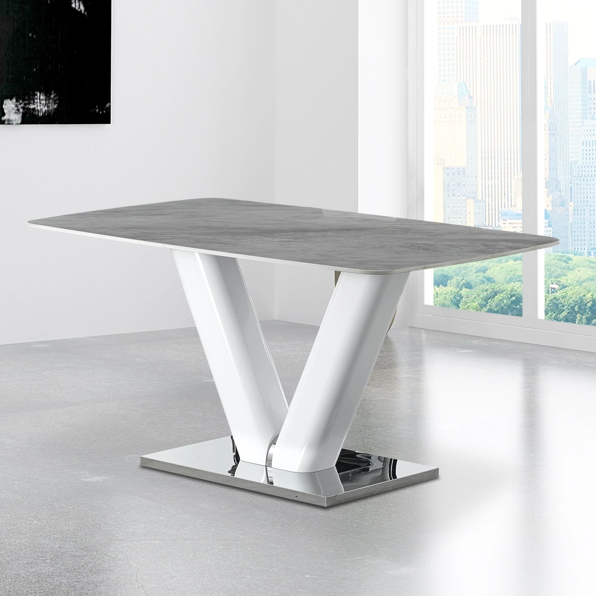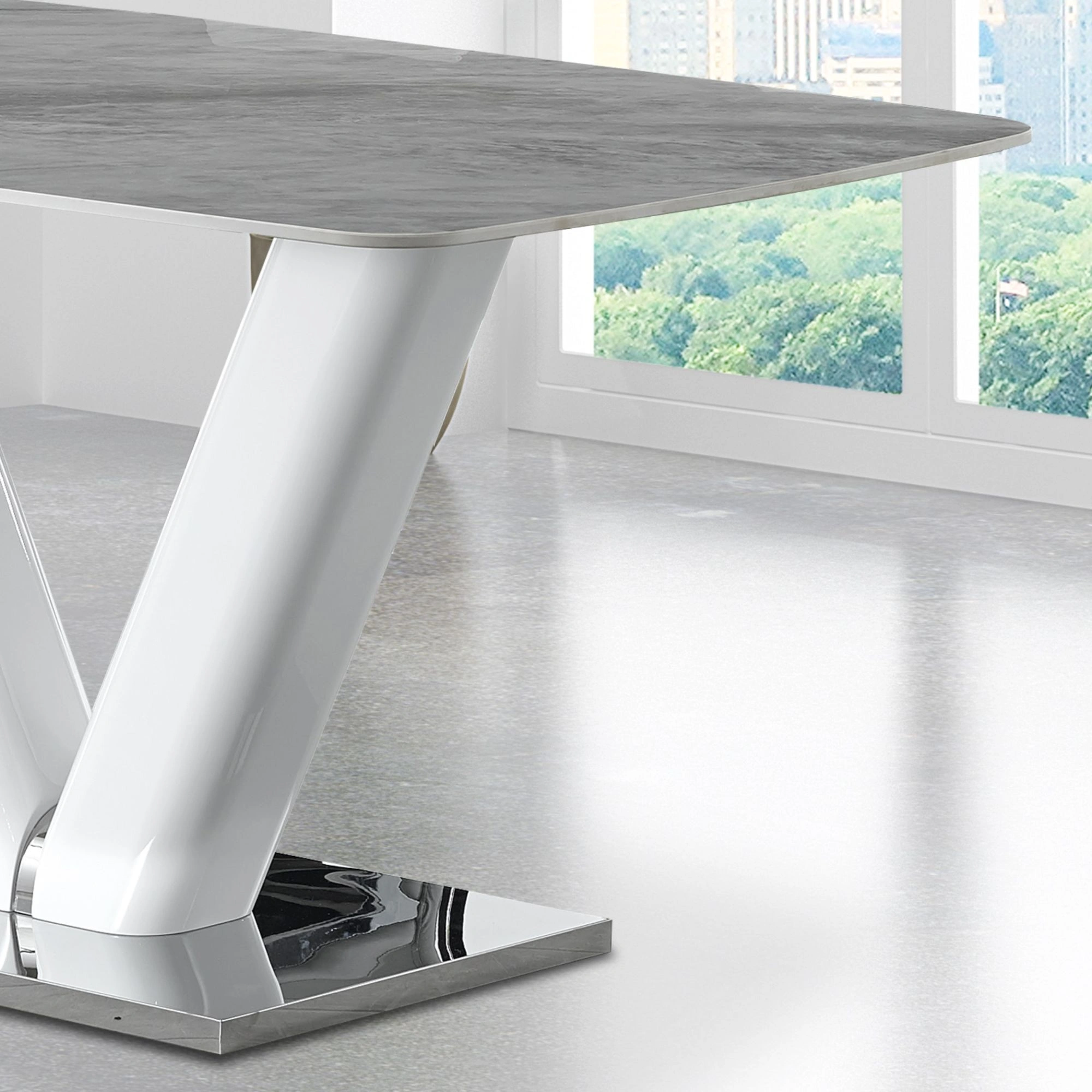 Jedilna miza Bloom združuje sodoben dizajn, trpežno mizno ploščo iz sintranega kamna in elegantno podnožje v kombinaciji bele in kovinske barve.