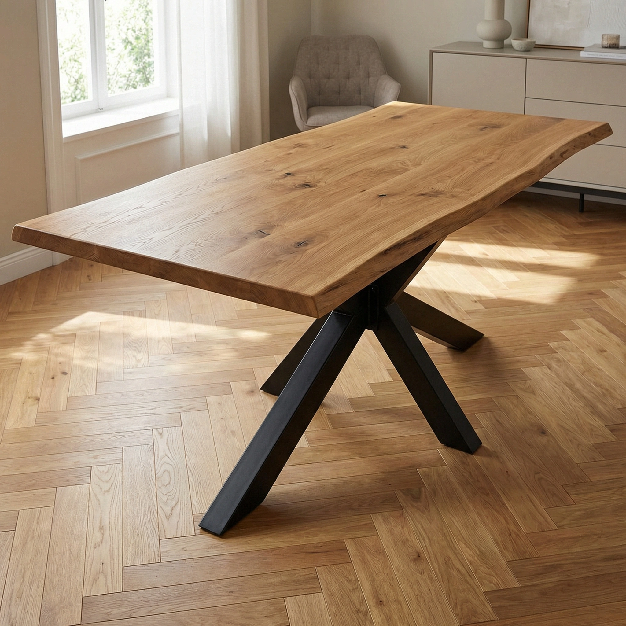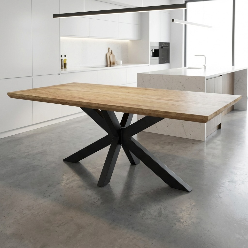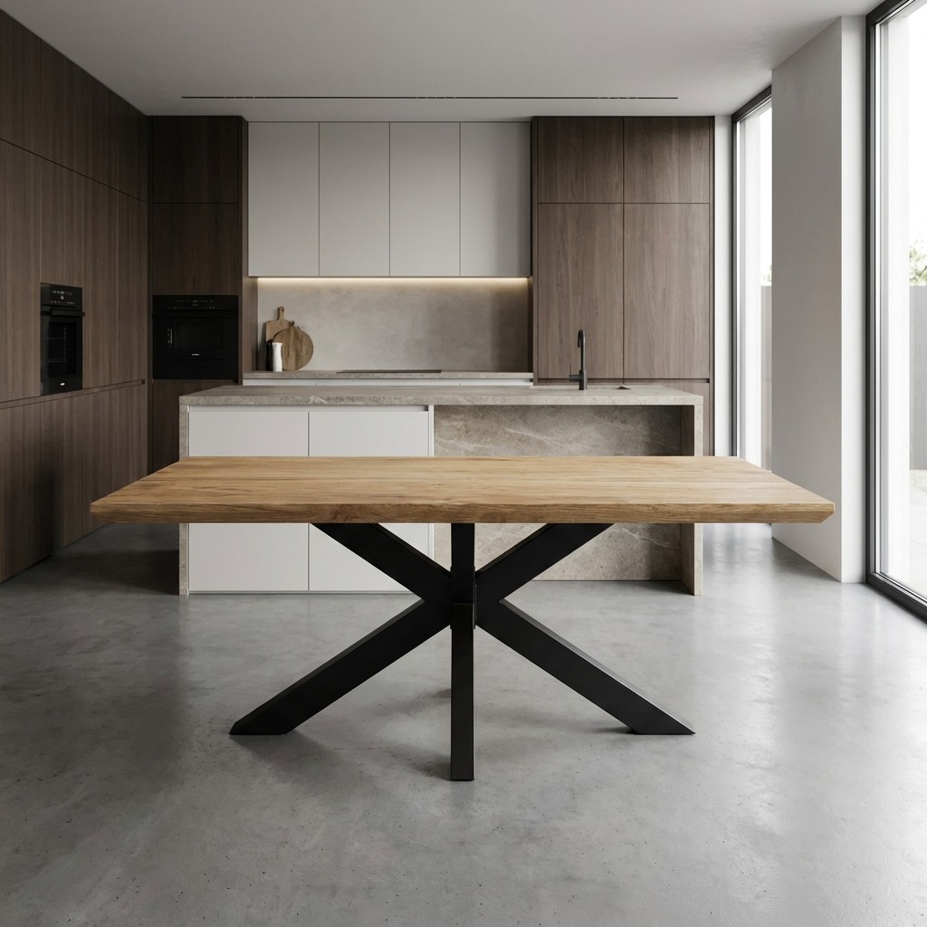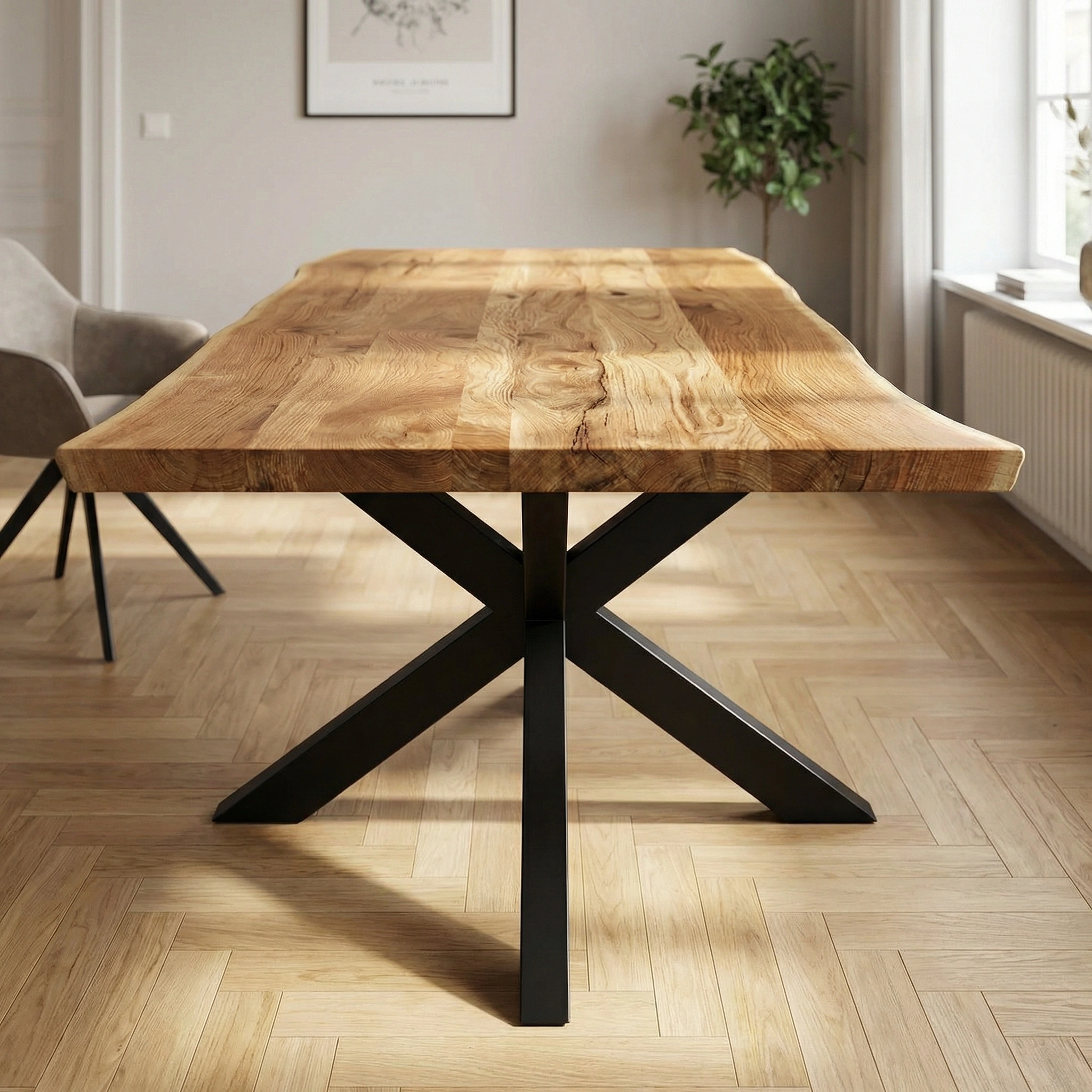 Lesena jedilna miza Elena predstavlja popolno ravnovesje med surovo močjo narave in industrijsko eleganco.