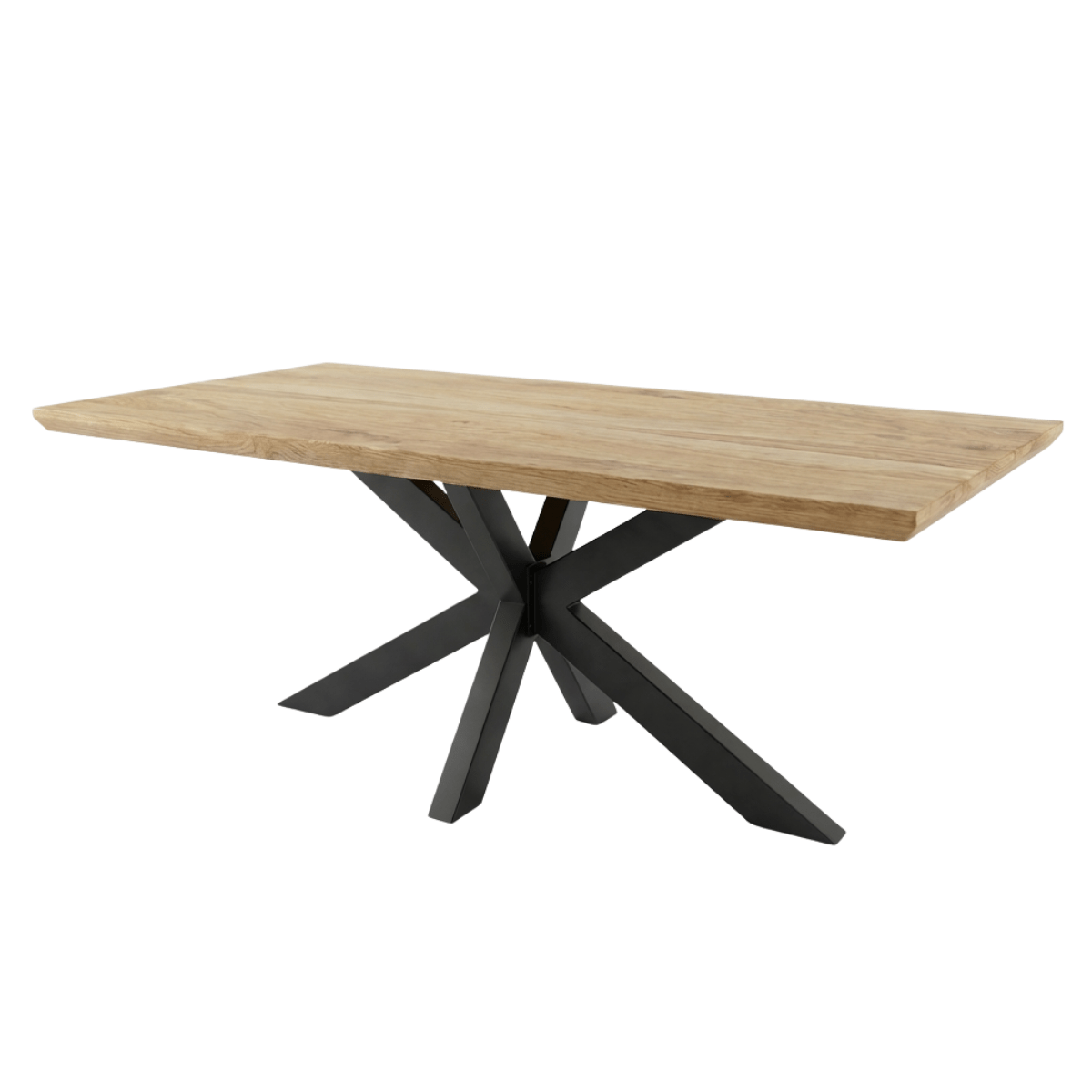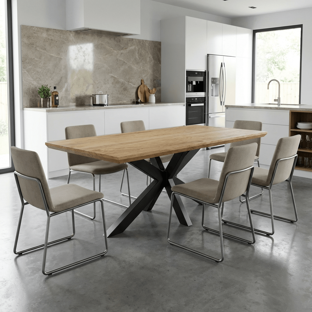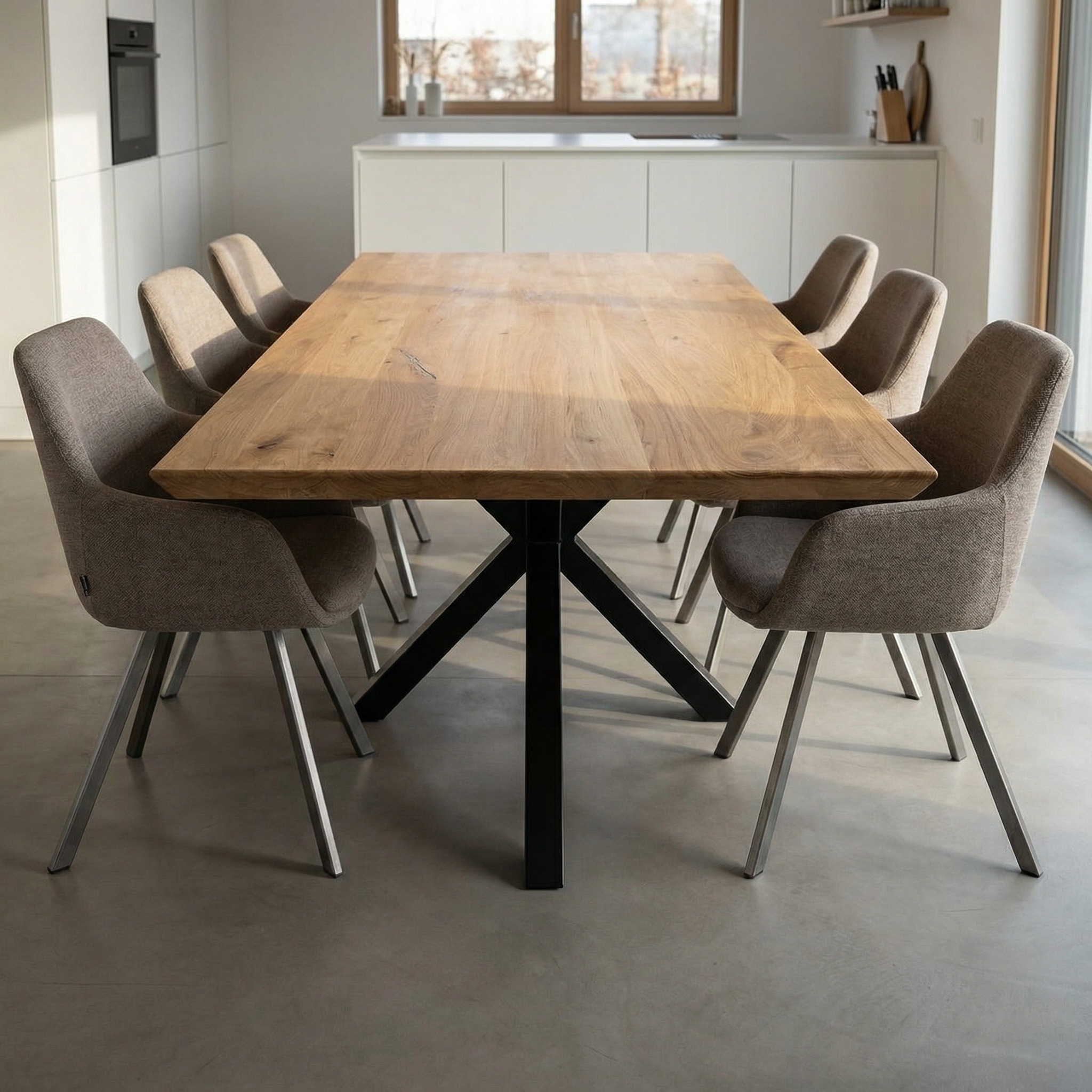Lesena jedilna miza Elena predstavlja popolno ravnovesje med surovo močjo narave in industrijsko eleganco.