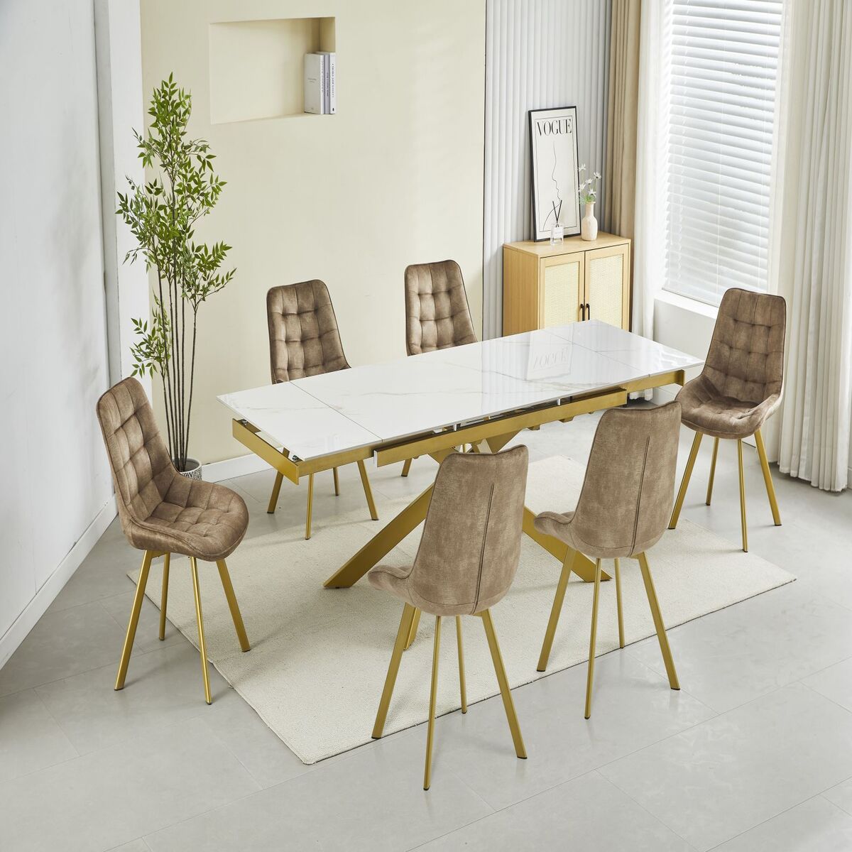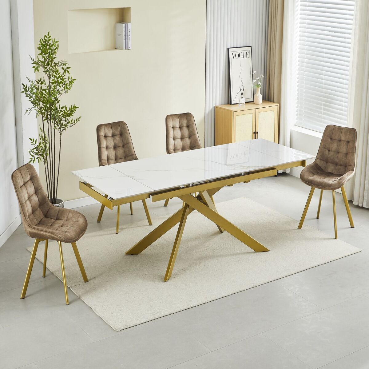 Raztegljiva jedilna miza GOLDIE predstavlja popolno zlitje sodobne prilagodljivosti in brezčasnega razkošja. Zasnovana za tiste, ki želijo svoji jedilnici dodati pridih glamurja, miza Goldie s svojo sijajno keramično ploščo in zlatimi detajli postane nesporno središče vašega doma.